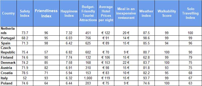 - The Netherlands is the best European country for solo travel, excelling in safety, friendliness of the residents, and high walkability.
